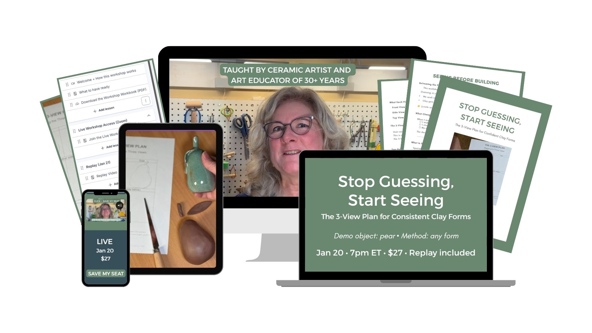 I’m Jacquie Blondin—ceramic artist and educator with 30+ years of teaching experience and a studio practice rooted in hand building and sculptural form. I've taught 4,250+ people through classes and presentations. My approach is practical and repeatable—so you can stop guessing and build with more confidence. In this workshop, I'll show you the 3-View Plan (Front/Side/Top) so you can map proportions before you build—and apply it to any form.