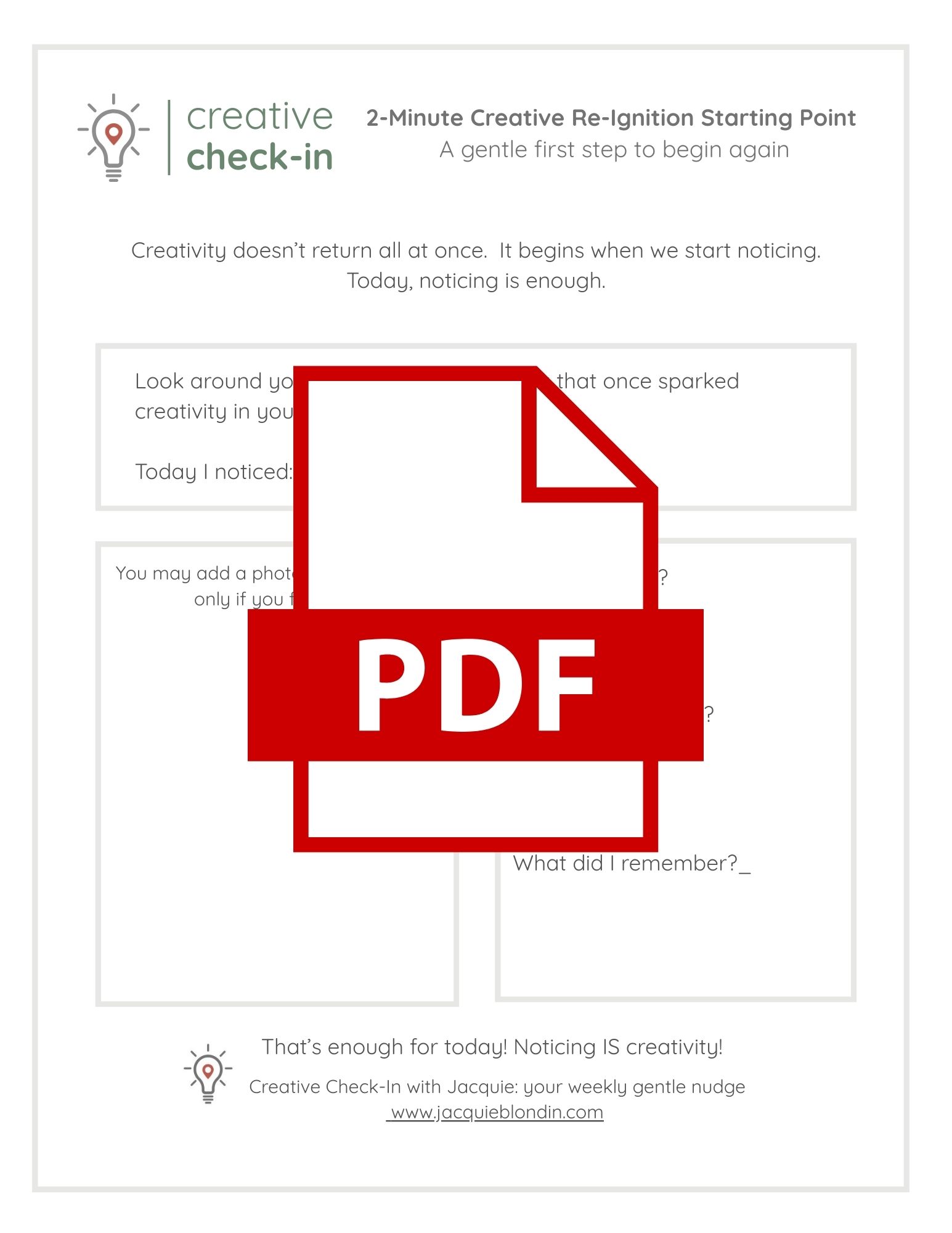 This gentle resource is made for midlife makers and returning artists who feel called back to creativity — but aren’t sure where to begin. If you’ve been away from your art practice for a while, this 2-minute worksheet offers a soft first step. It doesn’t ask you to make anything. It simply invites you to notice what once sparked creativity in you — because noticing is where momentum begins. Inside, you’ll explore: why movement — not inspiration — rekindles creative rhythm, a gentle method to re-engage your creative mind, and a simple reflection prompt for when you feel stuck. Creativity doesn’t return all at once. It begins when you start to notice again.